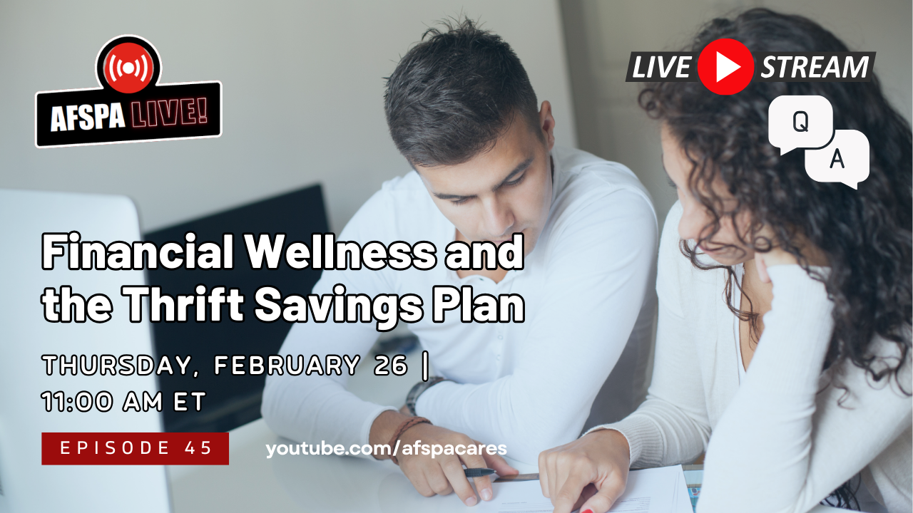 Do you have questions about Financial Wellness and the Thrift Savings Plan (TSP)? You’re invited to join our live Q&A session on Thursday, February 26, at 11:00 AM ET. AFSPA's CEO, Kyle Longton and COO, Twanisha Johnson will be available to answer your questions related to this topic.